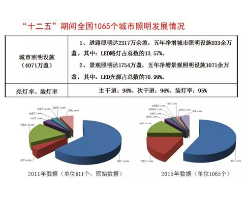 根据中国市政工程协会城市照明专业委员会的统计,截止2015年全国1065个城市现有路灯2317万盏,其中LED路灯占比13.57%。